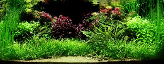 Ludwigia sp. và Limnophila Hippuridoidess tạo nên hậu cảnh dày và màu sắc còn những cây Eleocharis sp lại làm chúng ta nhìn ra những đường nét sắc cạnh. Sự rậm rạp của Echinodorus Tenellus phải được cắt tỉa khá thường xuyên nhằm kìm hãm sự ăn vào trung tâm.